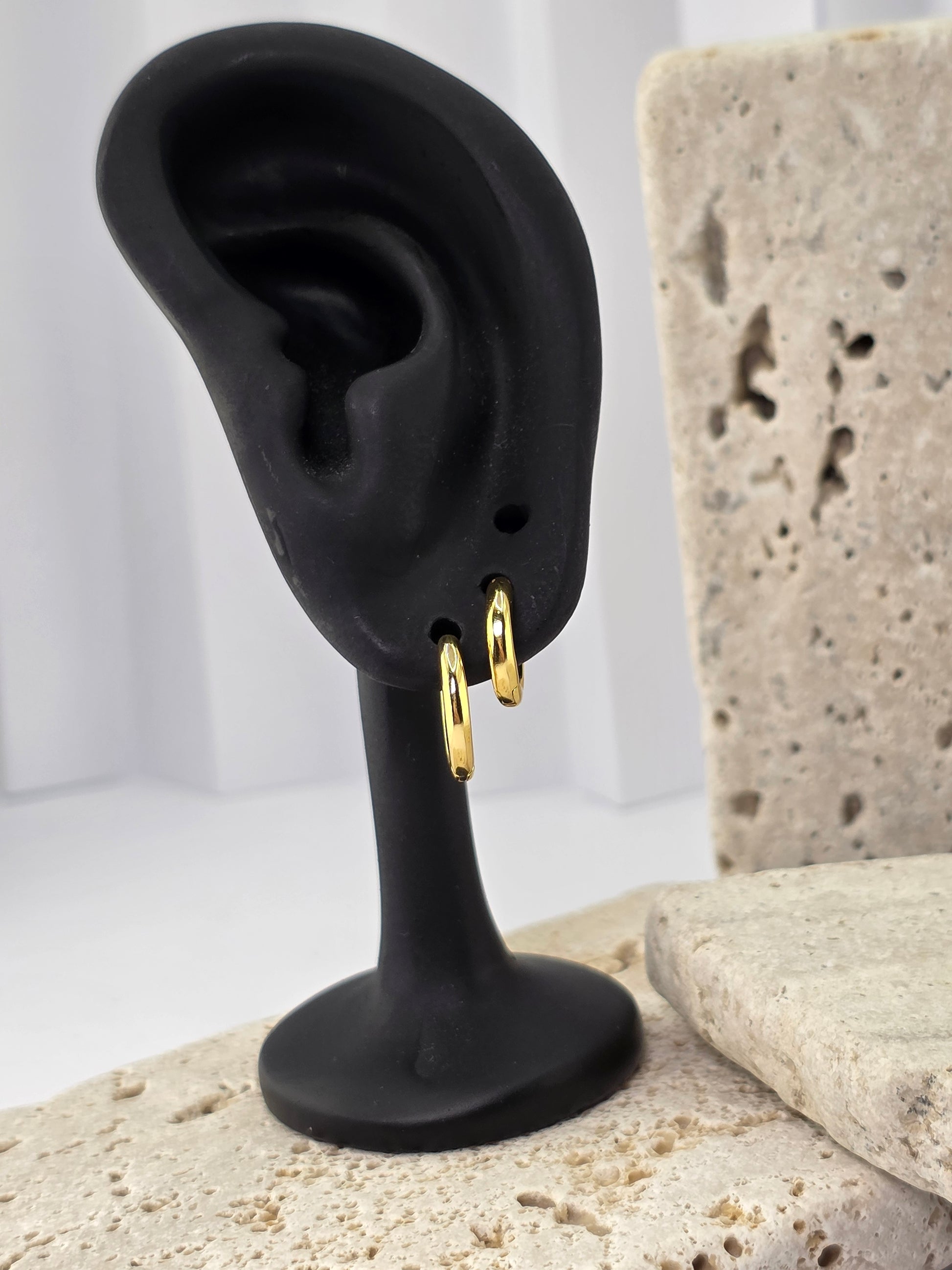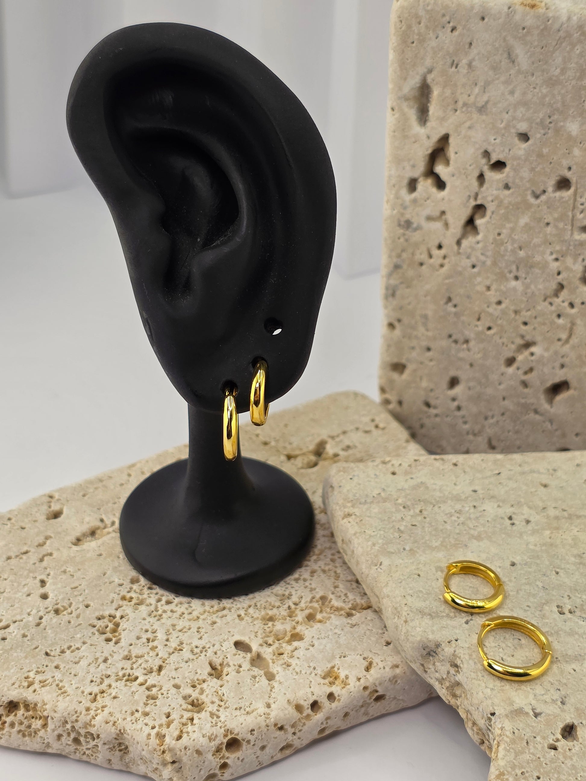 These minimalist huggie hoops are crafted from stainless steel and finished with a luxurious 18K gold plating – designed to bring shine without the high price tag. Available in two versatile sizes (12mm and 14mm), they’re perfect for a clean, modern look or stacked for a bold statement.
