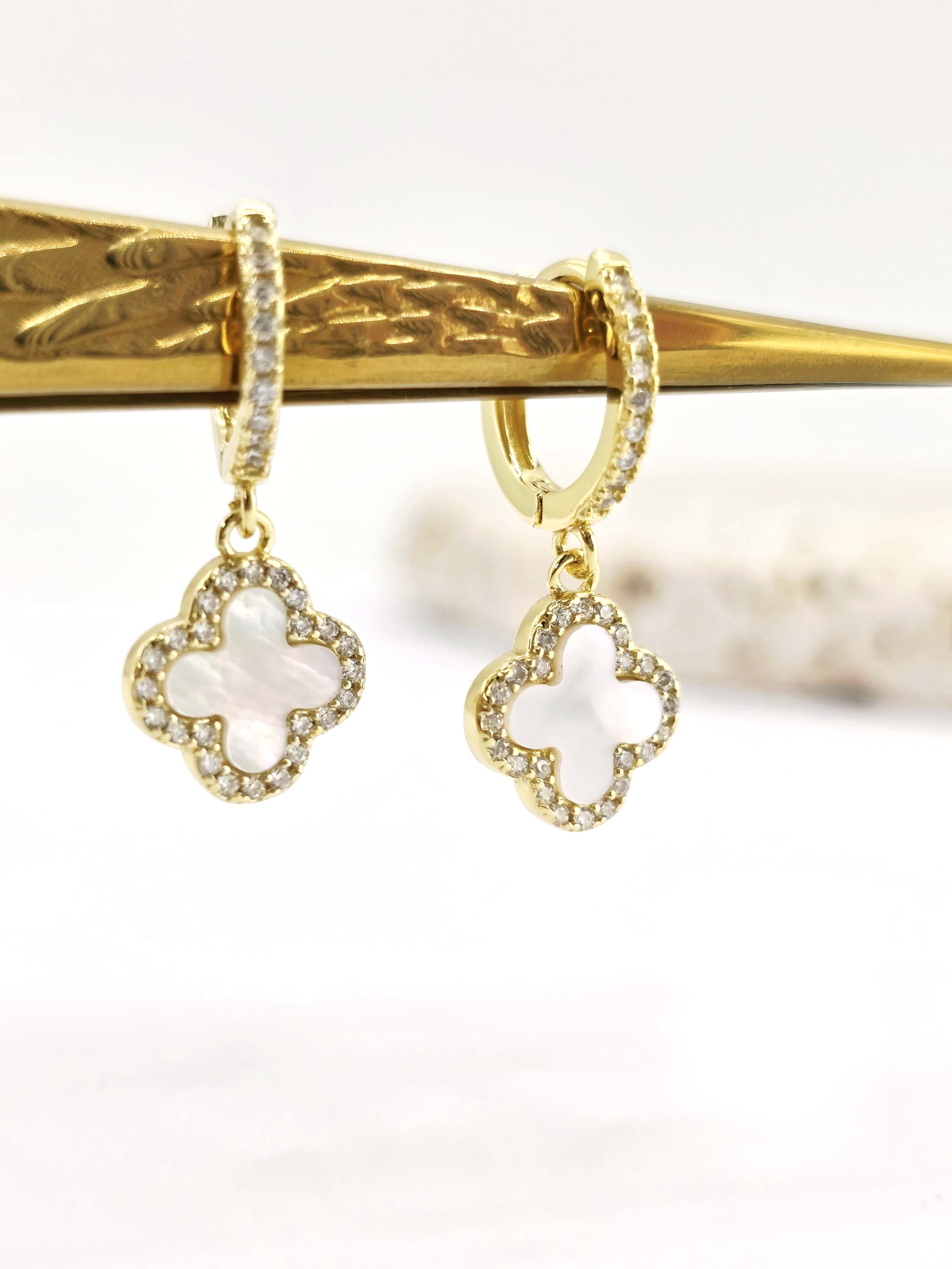 Add a touch of elegance and luck to your look with these stunning clover mini hoop earrings. Handcrafted from 925 sterling silver and finished with 14K gold plating, they feature a luminous clover charm outlined with sparkling cubic zirconia for a refined, luxurious finish.
