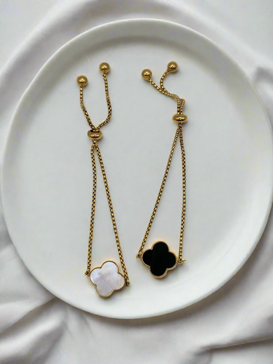 Bring a little luck and luxe into your everyday style with our Lucky Clover Adjustable Bracelet. Made from high-quality 316L stainless steel and finished with radiant 18K gold plating, this elegant piece features a signature four-leaf clover charm in your choice of mother-of-pearl white or onyx black.
