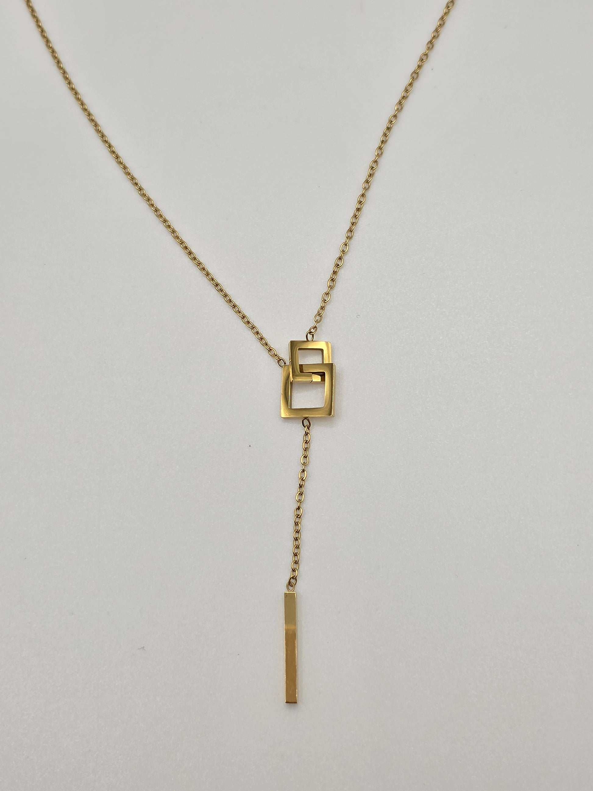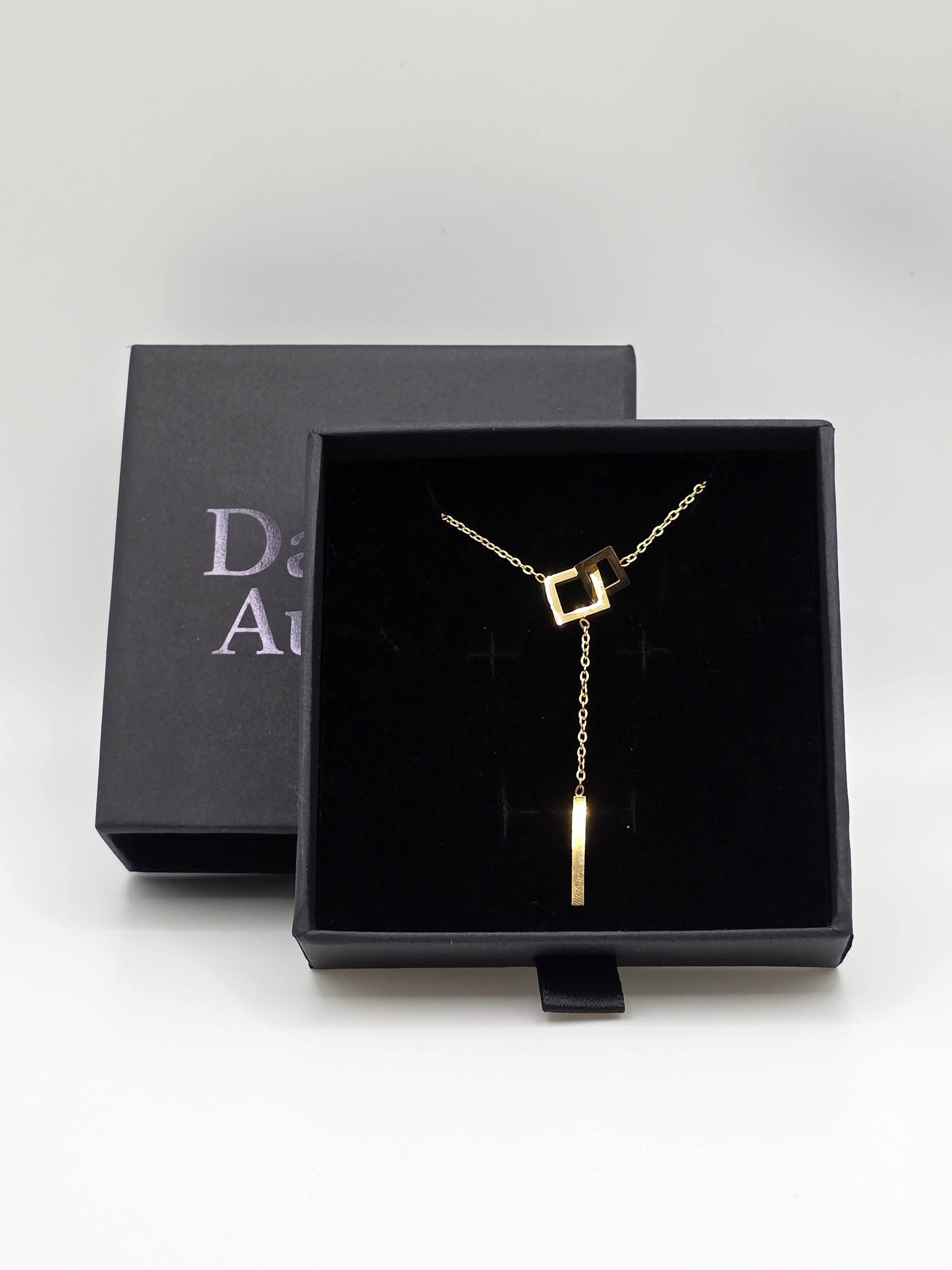 This minimalist necklace features a polished gold-tone square loop and vertical drop bar suspended on a dainty gold-plated stainless steel chain. Its architectural silhouette adds a bold yet understated touch to any look – perfect for elevating your everyday outfit or layering with other pieces for a statement combo.