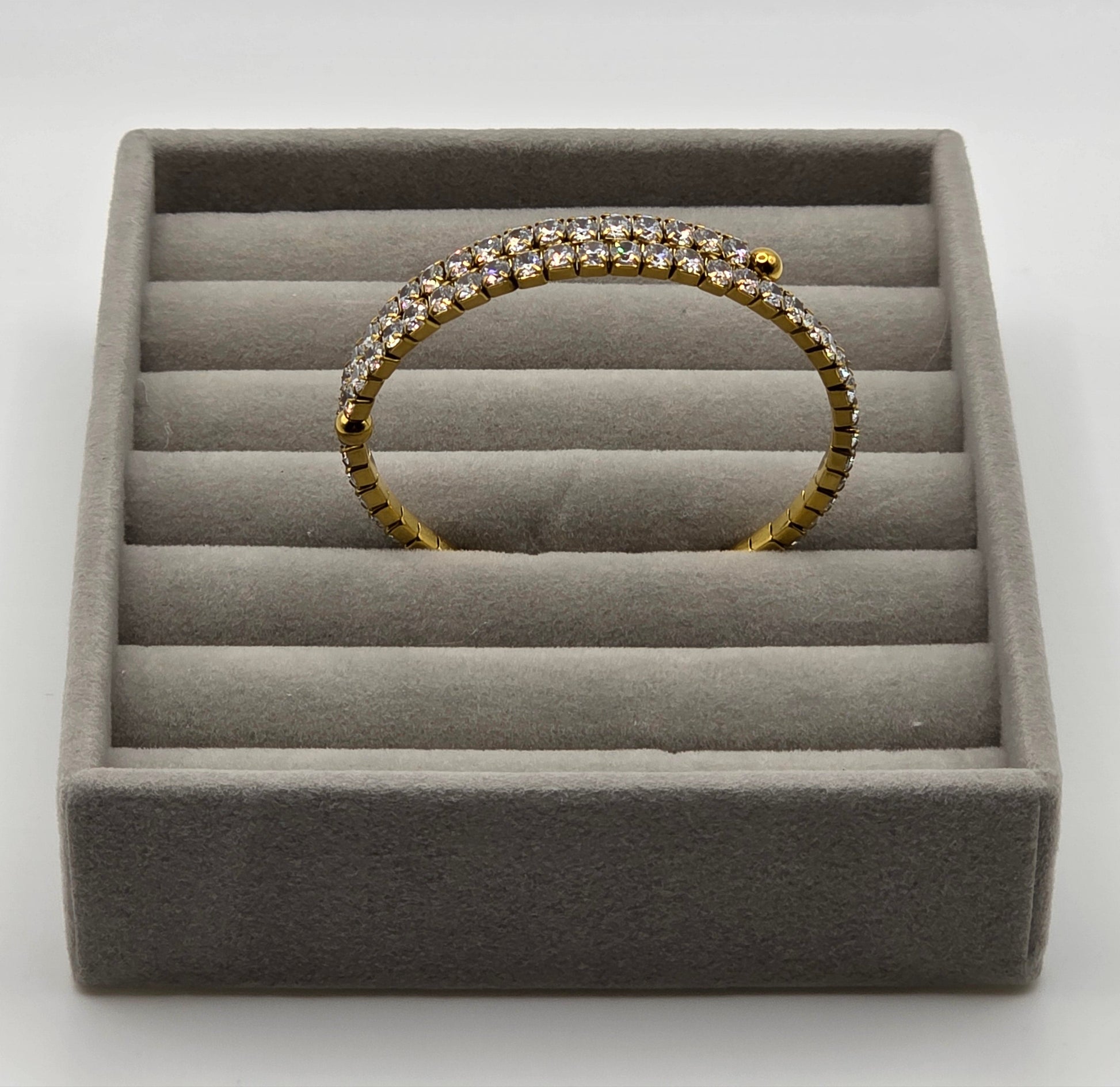 Drape your wrist in double the dazzle. This stunning tennis-style bangle features a row of high-shine crystals, perfectly aligned on a flexible gold-plated stainless steel band. Designed to hug your wrist with elegance and ease, this bangle is lightweight, waterproof, and adjustable for a flawless fit.